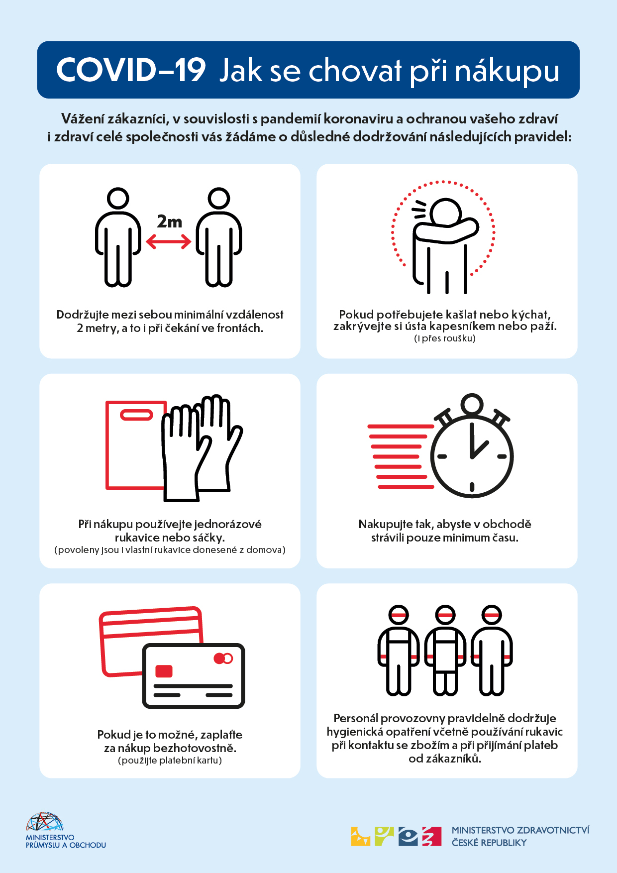 V návaznosti na usnesení vlády č. 395 ze včerejšího dne ZDE, kterým bylo schváleno mimořádné opatření Ministerstva zdravotnictví z 6. 4. 2020 ZDE je k dispozici leták Ministerstva průmyslu a obchodu, který si mohou provozovatelé prodejen vytisknout a vyvěsit ve svém obchodě a bude tím splněn bod č. 2 uvedeného mimořádného opatření.